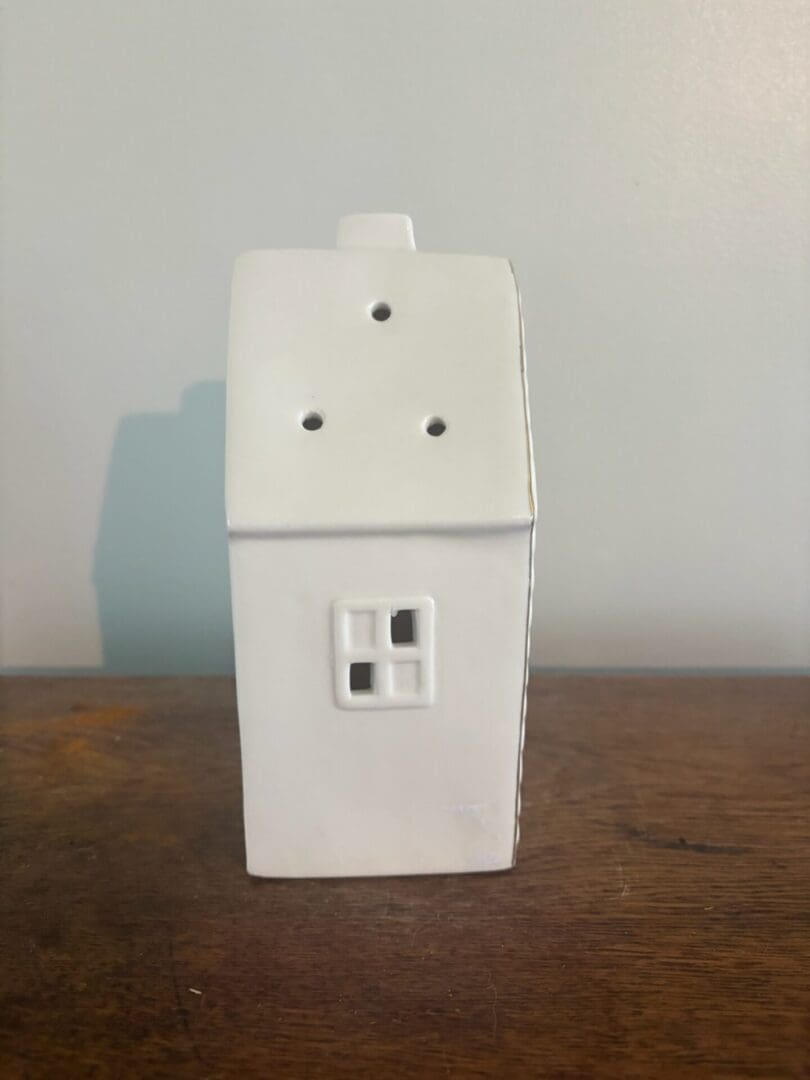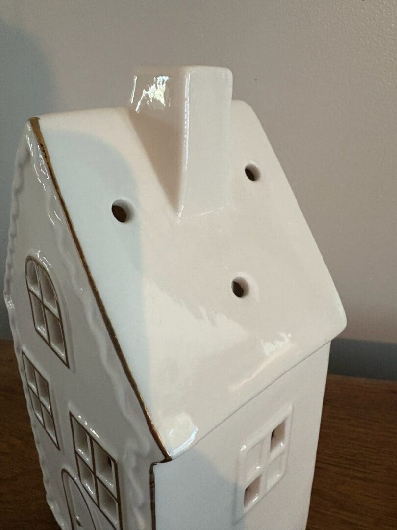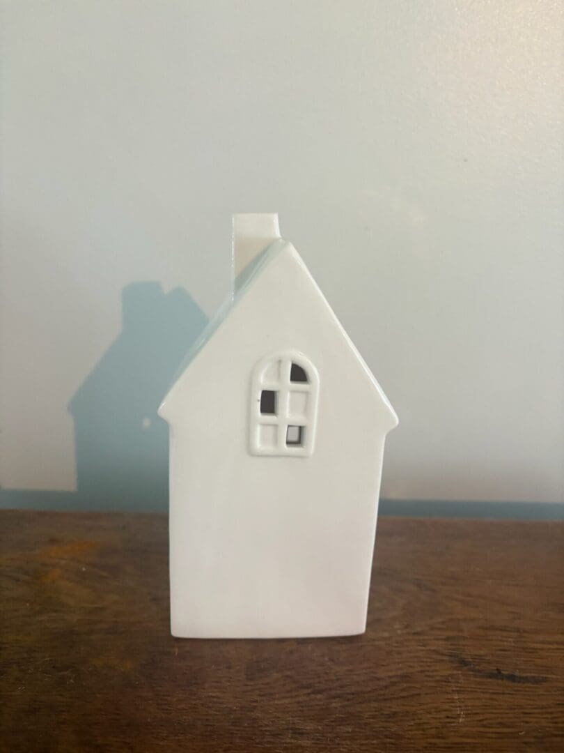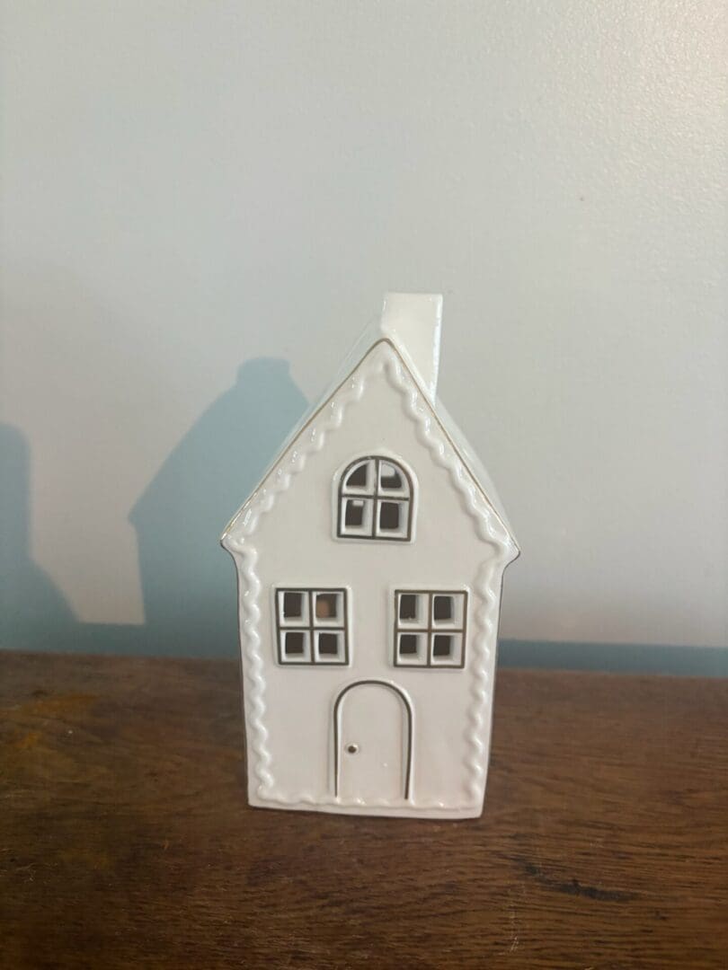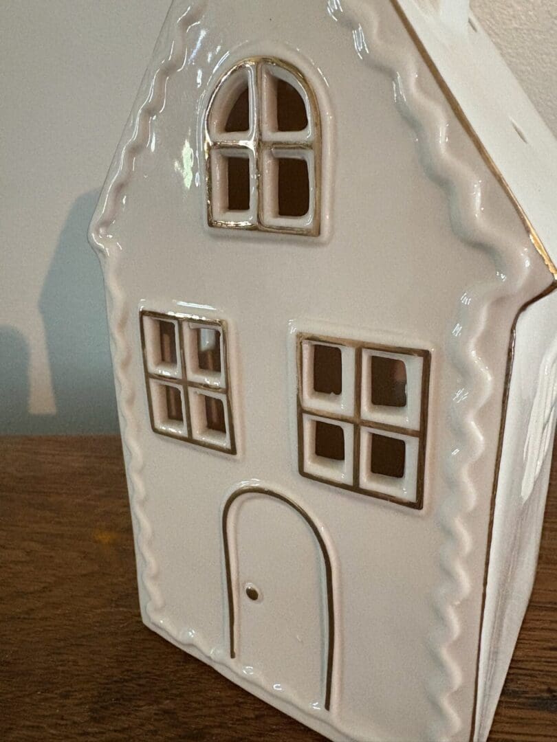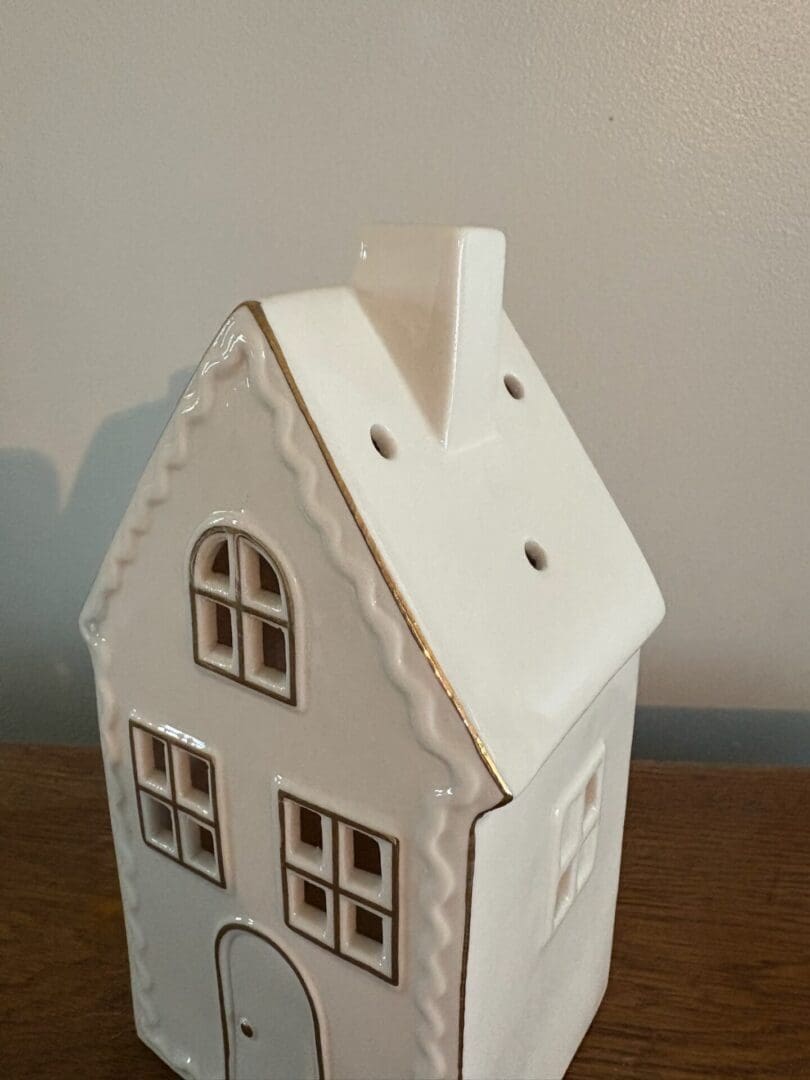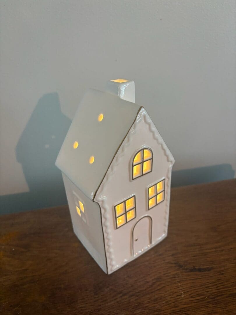 8″ LED white house with gold accents and a built-in timer – perfect for cozy holiday displays or pairing with its larger match.