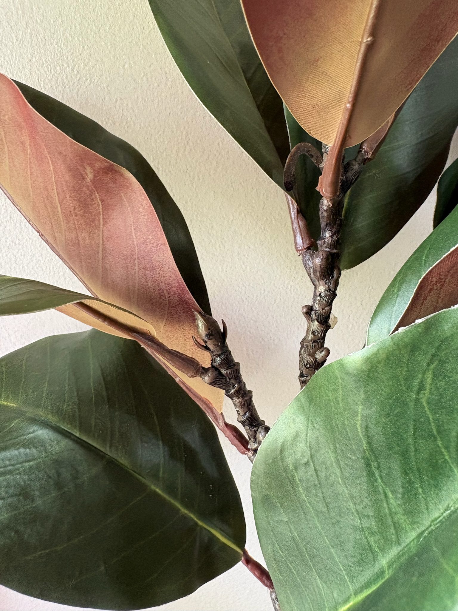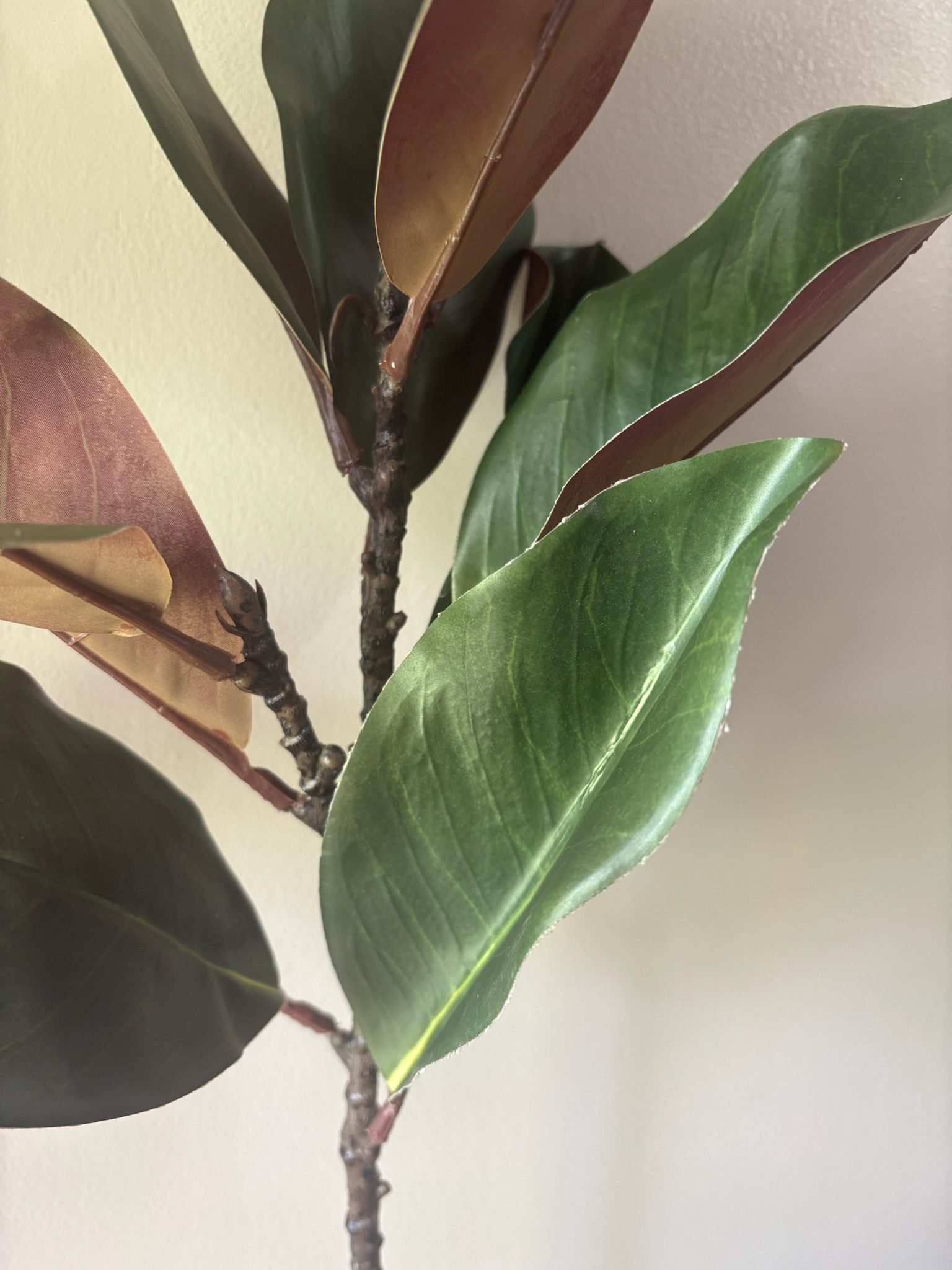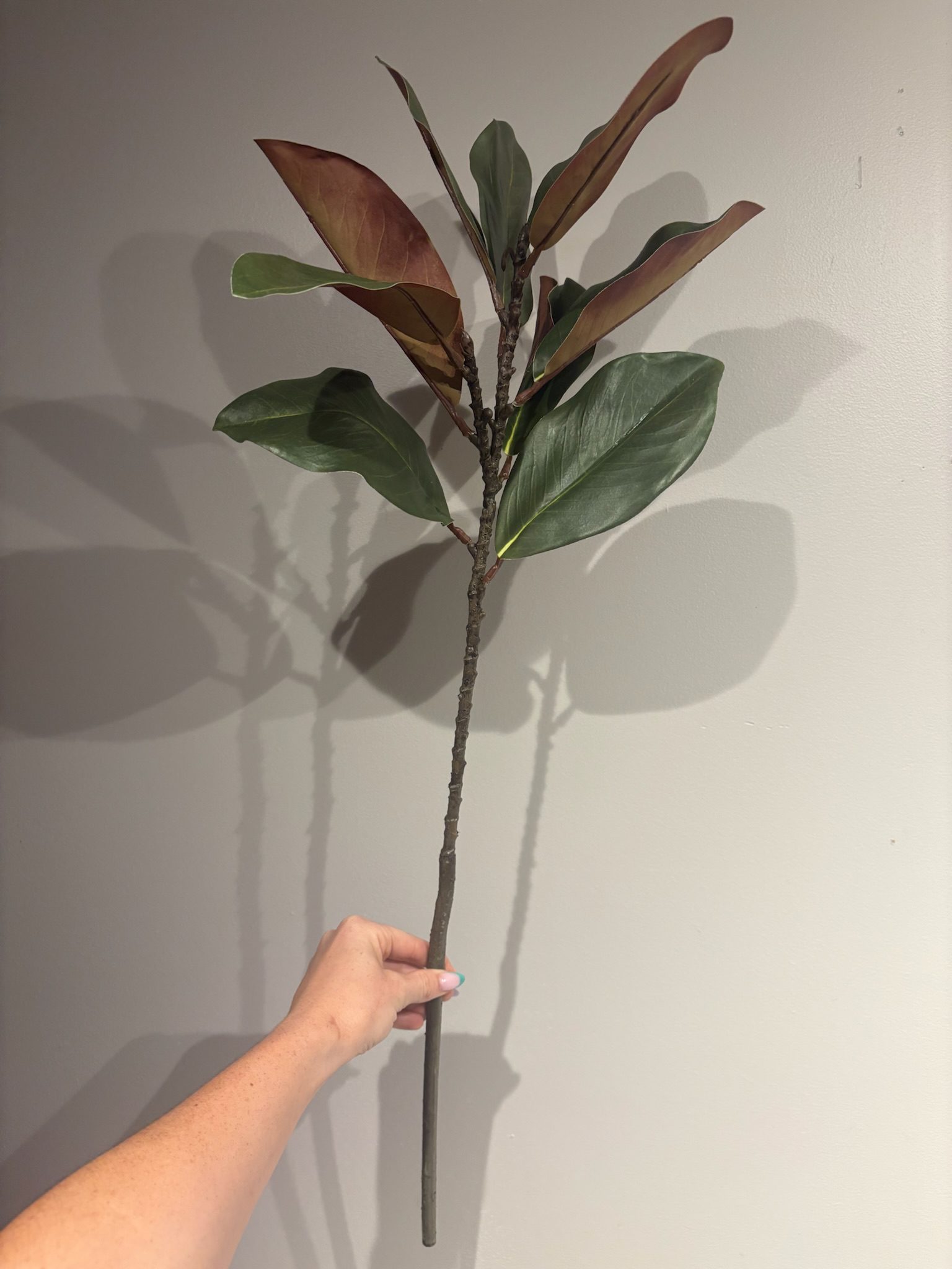 Bring nature indoors with the incredibly realistic Green Magnolia Stem. Crafted with care, this long and durable faux stem mimics the look and feel of a fresh magnolia branch. The thick, veined green leaves are finished with a brown underside, just like real magnolia foliage, and the bark-textured stem adds an extra touch of authenticity. Another added benefit to its length is you can cut it to fit whatever you’re decorating. you’re not stuck to all one length!