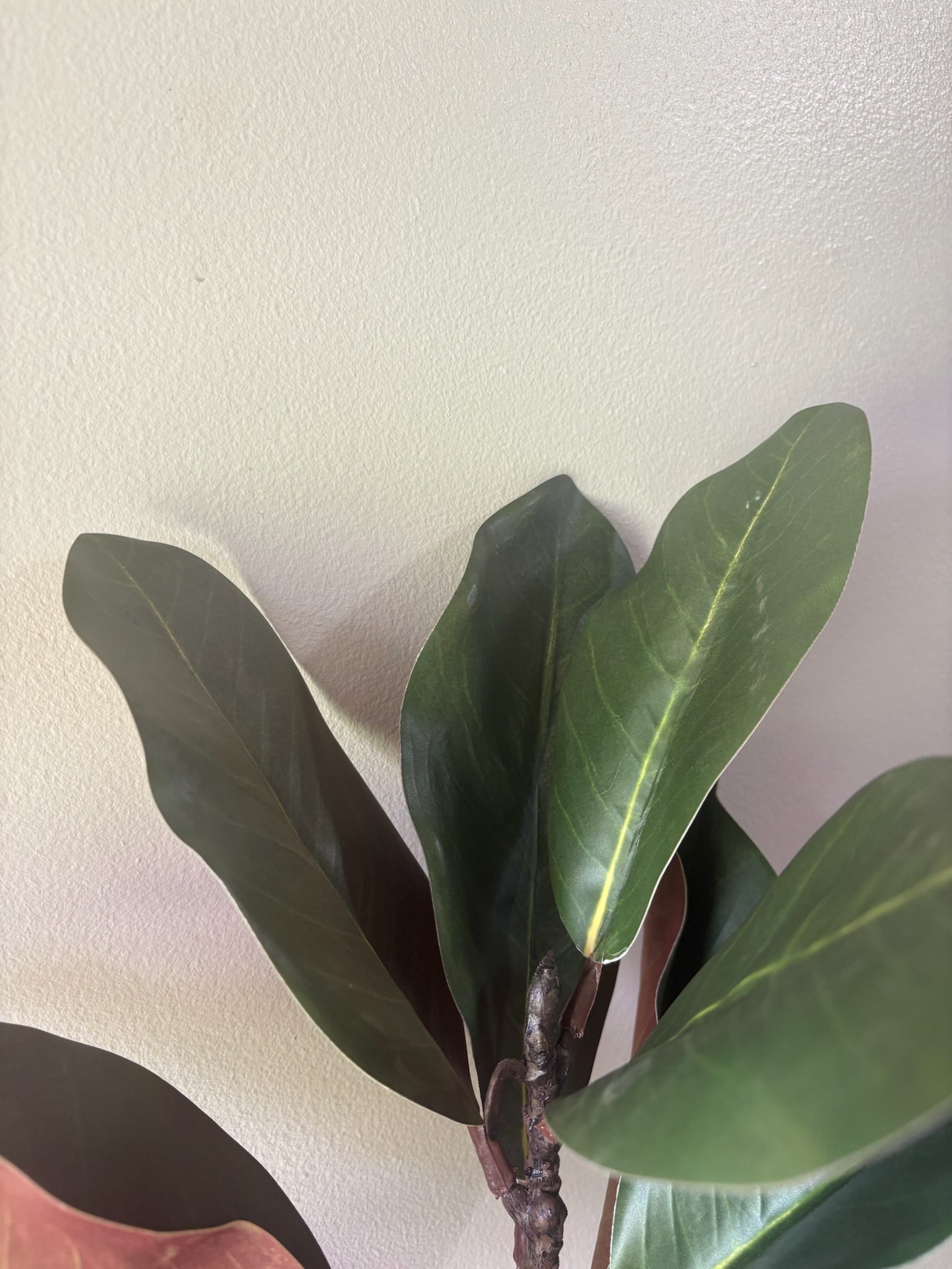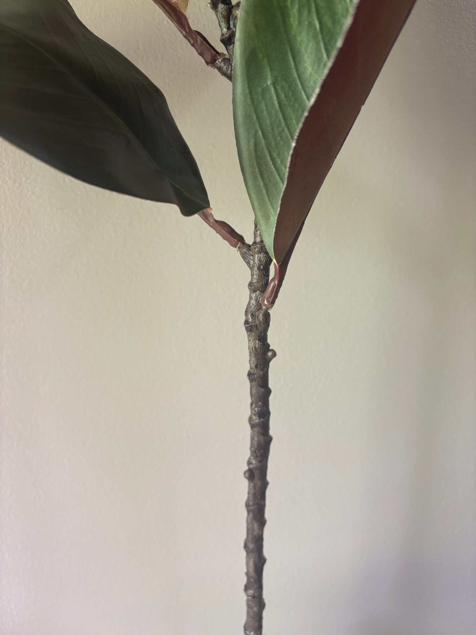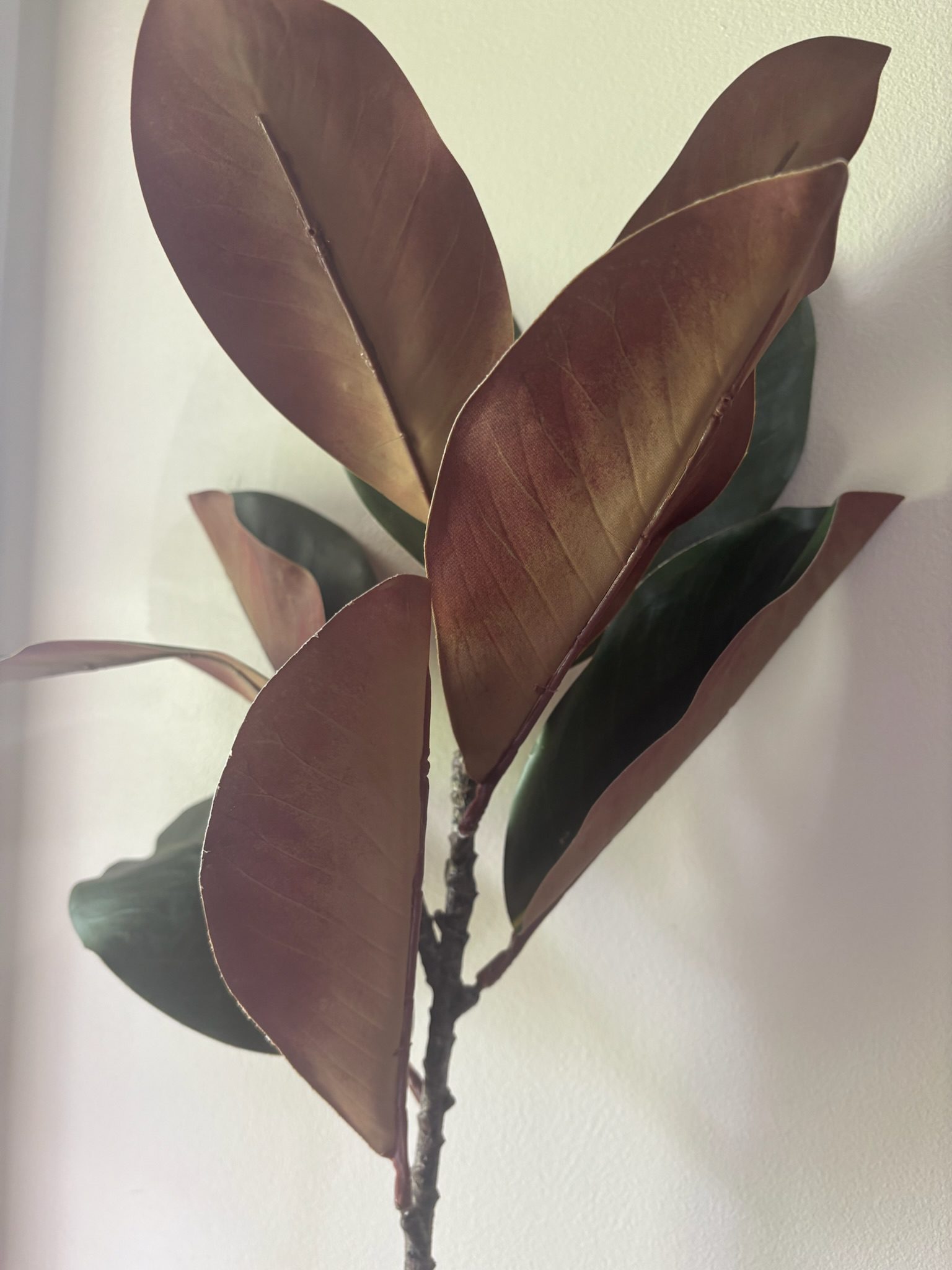 Bring nature indoors with the incredibly realistic Green Magnolia Stem. Crafted with care, this long and durable faux stem mimics the look and feel of a fresh magnolia branch. The thick, veined green leaves are finished with a brown underside, just like real magnolia foliage, and the bark-textured stem adds an extra touch of authenticity. Another added benefit to its length is you can cut it to fit whatever you’re decorating. you’re not stuck to all one length!
