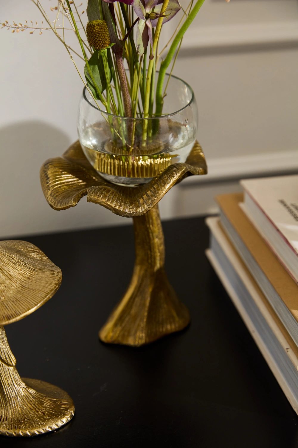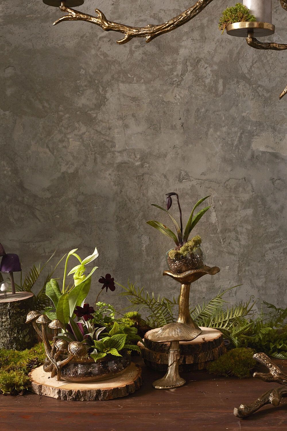 The nature inspired Lichen Planter features a gold metal mushroom base that holds a glass bowl for planting. This fanciful design feels like it sprang up in the forest to hold a dreamy planting.